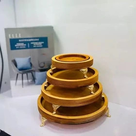 سینی چوبی 5تکه پذیرایی پایه دار قطر 3 سانت سینی مزه خوری چوبی 5تکه پایه طلایی ست پذیرایی چوبی گرد