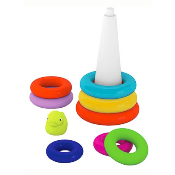 ین بازی از نه حلقه تشکیل شده است که به رنگها و اندازه های مختلف می باشد. و یک استوانه که قرار است کودک حلقه ها را روی آن قرار دهد. برای شروع مهم نیست که کودک ترتبیب این بازی را بداند و هدف این است که کودک با جستجوی خاص ذهنی بتواند این کار را انجام دهد. اینکه کودک در هر بار یک سیستم خاص را در این بازی ایفا می کند می تواند یک تجربه خاص برای آن بازی باشد.کودک در این بازی با انواع رنگها آشنا می شود. و علاوه برآن حل مساله از طریق آزمون و خطا ، برانگیختن توجه ، آشنایی با مفهوم اندازه ، آشنایی با مفهوم تطبیق دادن ، دسته بندی اشیا، شناخت رنگها از مواردی است که دراین بازی می توان به آن دست پیدا کند. هدف از این بازی تجربه کردن تفکر آن هم ازنوع آزمون و خطاست .